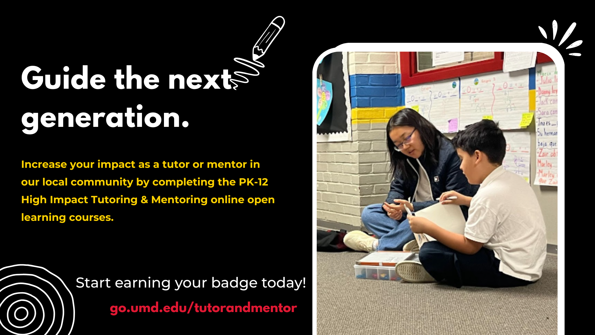 - This course introduces key foundations for UMD students who are serving as tutors or mentors in a PK-12 setting. Completion of the online course will result in the "PK-12 Tutoring and Mentoring Foundations" micro-credential. Participants will enhance their ability to create meaningful and professional connections with young learners, understand high-impact tutoring strategies, and identify ways to adapt one's practices to learners' needs.