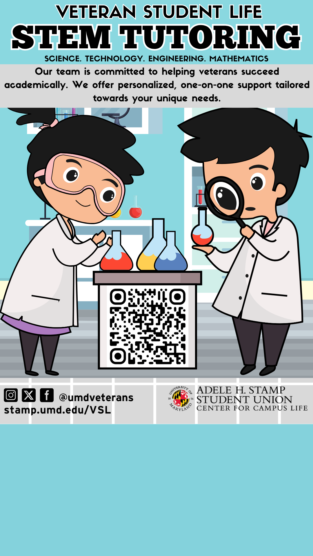 If you're a current veteran or military-connected student seeking personalized support in your STEM courses, the STEM Veteran Assistance Program at the University of Maryland is here for you. To take advantage of one-on-one tutoring, simply fill out the form at stamp.umd.edu/Fall2026Tutoring